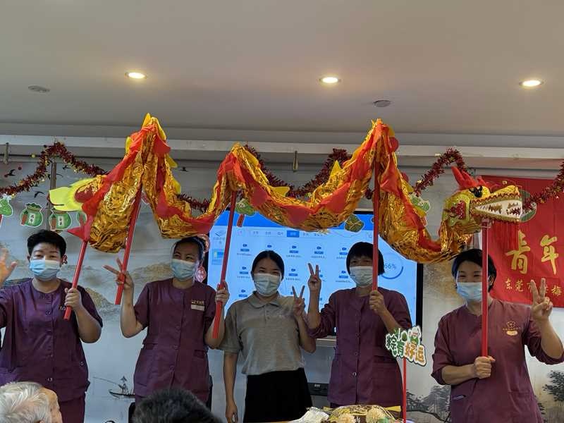 为了让长者们更直观感受传统文化的活力,活动现场特别增设了护理员、护士与长者共舞金龙的环节。一条装饰着艾草与彩绸的金龙在大厅中央翻腾,护理员们举着龙身,护士们引导长者触摸龙头,寓意“摸龙头,纳安康”。101岁的陈奶奶颤抖着伸手抚摸龙头,激动地说:“小时候看龙舟赛,最盼的就是摸龙头,没想到老了还能圆这个梦!”。