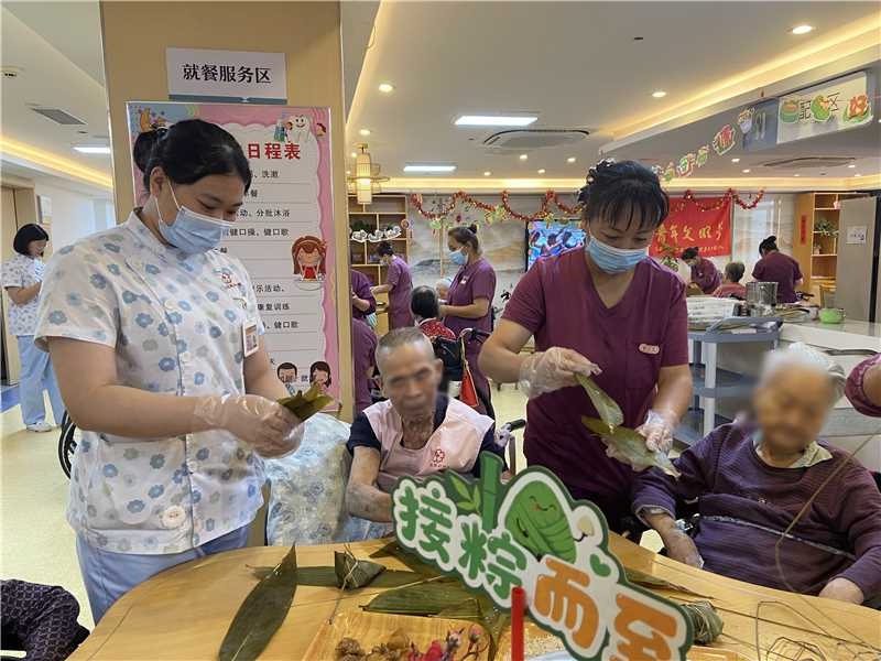 活动全程,护理员与护士们始终将长者的安全与舒适放在首位:为听力下降的长者重复讲解包粽步骤,每隔15分钟巡视长者的面色与精神状态,用轮椅护送行动不便的长者往返活动场地。在成果分享环节,护理员们提前与厨房沟通,将长者包的粽子单独标记,确保晚餐时每人都能品尝到自己的劳动成果。
