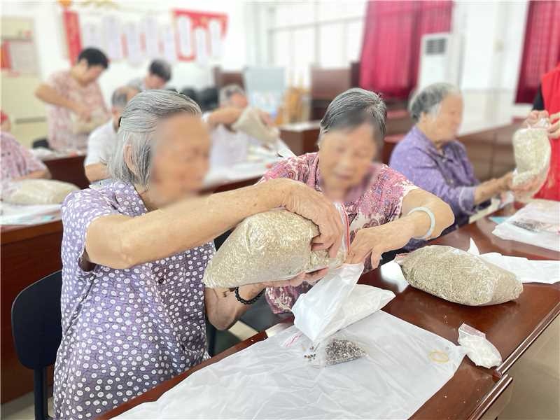 紧接着在服务团队的指导下,老人们开始动手制作属于自己的艾枕。大家先将艾绒、海盐和中药混合后装入无纺布袋,确保填充均匀,再用透气性好的棉麻布套在无纺袋外层,既美观又防漏。